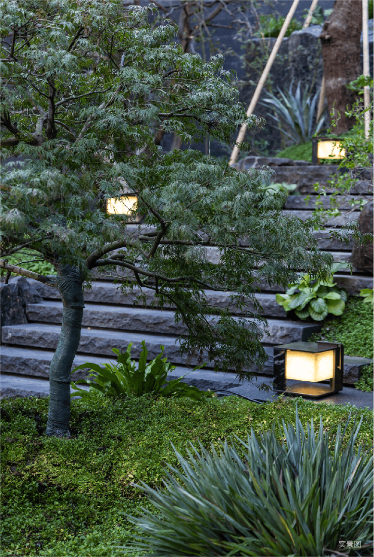 而实景首开的近2000㎡下沉庭院,作为“园林灵魂”,漫步此间,你会看见:乌金原石围合的“玉扣绿岛”上,低调静放着团队自“天下玉源”河南南阳历时遴选而来,近7000年的“国玉”独山璞玉,与山野林木共此氤氲灵气,尽显东方温润;从诗经走出来的近11m高参天乌桕,则再现古诗中所描述的“秋林城郭画图中,乌桕千株照眼红“的诗意;采用约6.7m幻影蓝奢石打造的“叠级水瀑”跌水台,池底以呈现天然墨绿色泽的蓝金刚石铺就,映水之澄明,境之悠远;连台阶都采用了“黑色花岗岩之王”安哥拉黑整石,沿云梯而上,让人返璞内心东方......