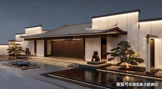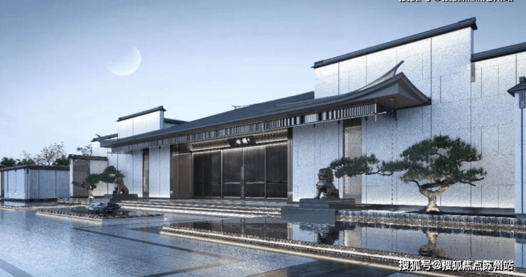 整个大门的形制, 以新中式风格为基调,采用庄严的对称形式作为迎宾入口。既沿袭了「歇山形制」中式规格,同时又进行了现代手法的创新。