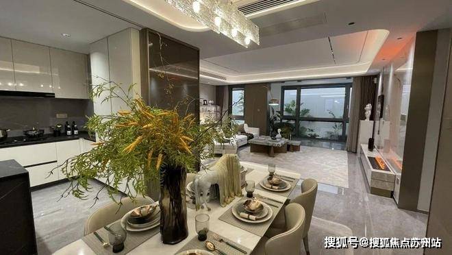 建筑面积约165㎡户型样板间, 打造南向4.5开间,即在4开间的基础上,通过设计手法将餐厅、客厅、厨房、阳台融为一体,让传统竖厅的通透格局同时具备横厅的宽广空间。