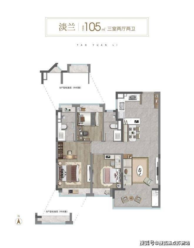 户型设计方面,105㎡样板间打造标准的三开间朝南设计,加之 约3.1米的层高配置,整体居住体验明亮开阔。