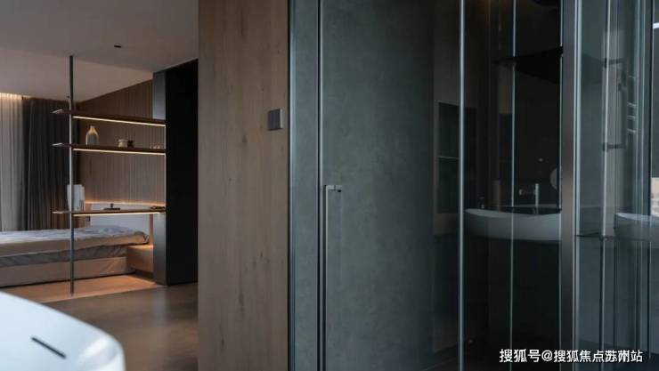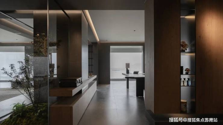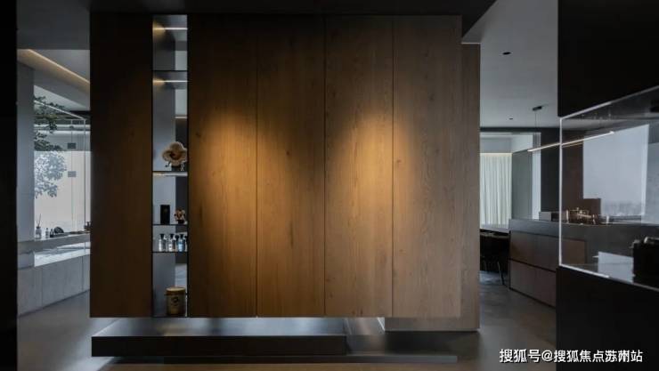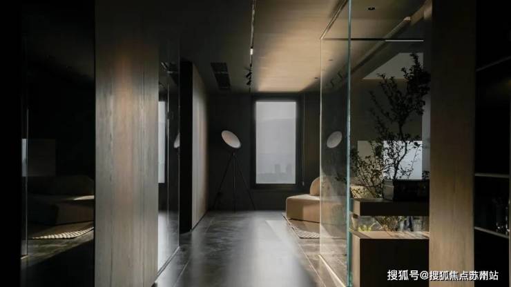 夕阳西下之时,晚霞和水面的波光映入客厅,穿过玻璃房来到书房、玄关,为暗黑系的公共空间带来可遇不可求的“限定皮肤”。
