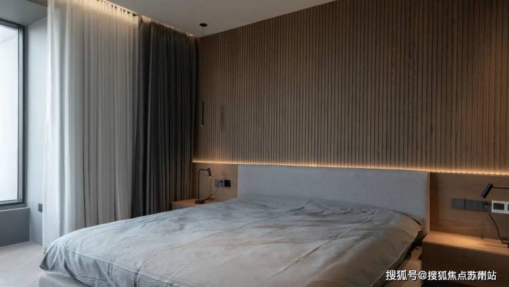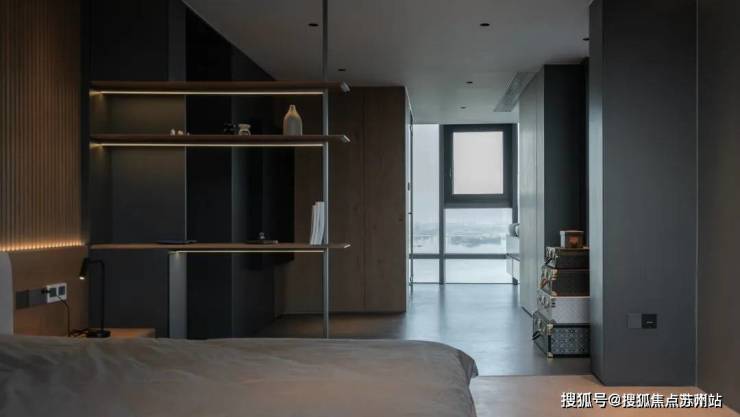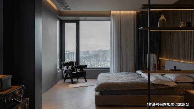 主卧没有繁复的元素,窗景本身就是最好的装饰。公共区域深灰色的墙体同样出现在卧室,如相框一般展现着都市不同时刻的夜景。