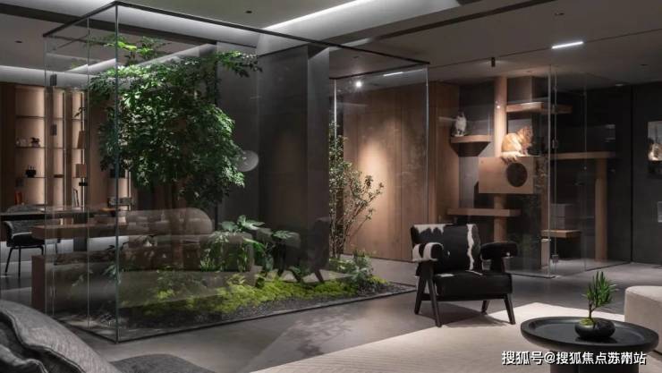 植物房中预留了排水和足够屋主通行的通道,方便平时对绿植的打理和浇灌。植物房对面是专门为猫咪打造的 玻璃猫屋,借助承重墙巧妙地形成了一个内凹的小空间,作为它们的私密区域。
