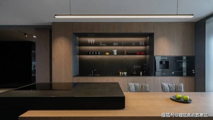 岛台餐桌一旁的餐边柜,嵌入式烤箱、上下水、各种茶具一应俱全,一站式满足泡茶、冲泡咖啡和烘焙等多种需求。