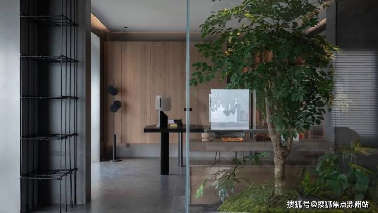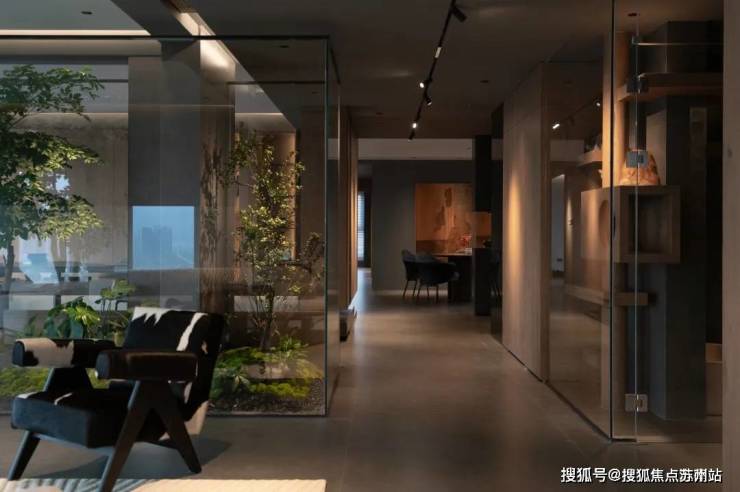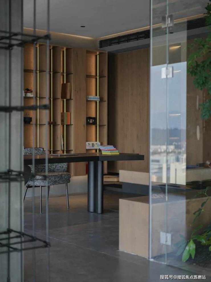 来到客厅和书房之间,透明的 玻璃植物房作为两个空间的分界线,隔而不断的效果在引入更多自然光的基础上,确保窗外景观的完整展现。