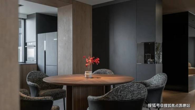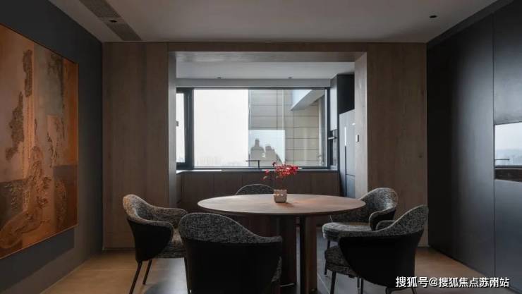原木材质的圆桌,深色木纹与家中的暗黑色调相得益彰。每天傍晚坐在这里用餐时,还能有机会欣赏到客厅窗外“长河落日圆”的美景。