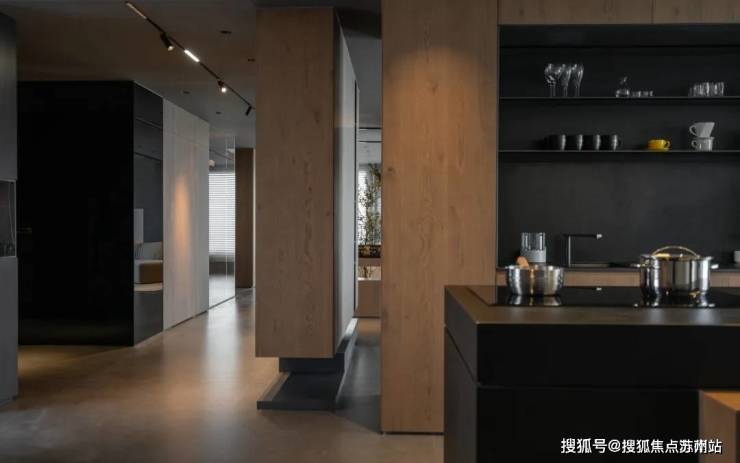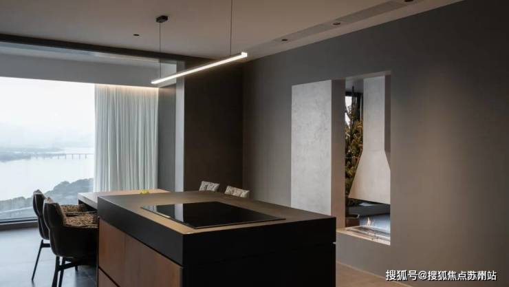 围绕着岛台餐桌的 西厨区,不但可以直接欣赏到从客厅延展而来的江景,书房墙体和柜体之间留出一部分距离,也能窥见玻璃植物房的景观。