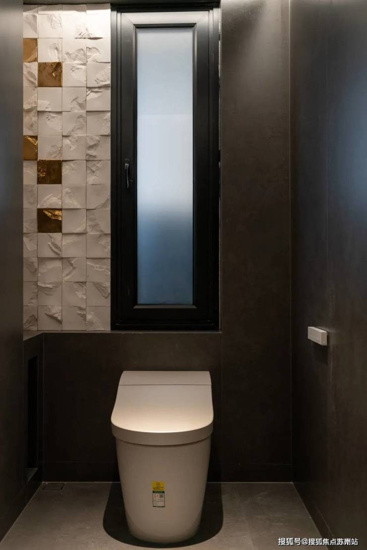 公共区域的马桶间则更凸显了暗黑色系的魅力,墙面的白色嵌金色艺术砖造价不菲。设计师在观望一段时间后,赶上了厂家做特价的寡料,数量刚好够用,为屋主节省了一笔开支。