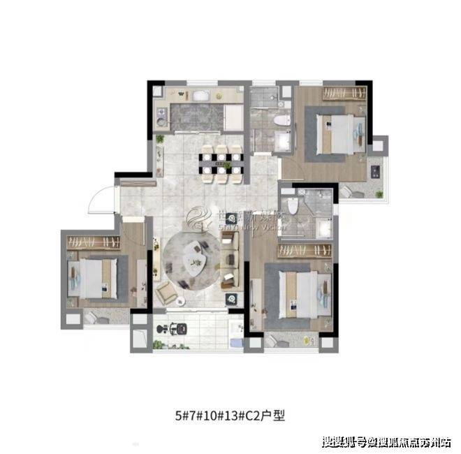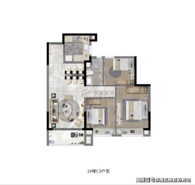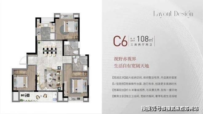 上海奉贤大名城·映雨江南售楼处电话☎:400-8123-664(预约看房热线)建面约108㎡3房2厅2卫,做到了三开间朝南+双阳台设计+主卧套房设计+南北通透,该户型得房率非常高。
