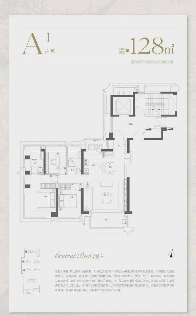 约128㎡ A户型 ,动静分离格局,功能区与休息区互不干扰,超大南向面宽+270°采光面,客厅开间达到了约5.4米,景观视野突出。