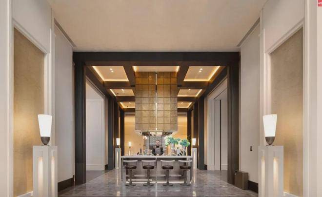 建面约190㎡ C户型 ,两梯两户,私享梯厅,家的玄关尺度,延伸至电梯厅,增加实际使用面积。入户处 大师定制瓷板门牌画 ,私属感满满,打造专属归家仪制。