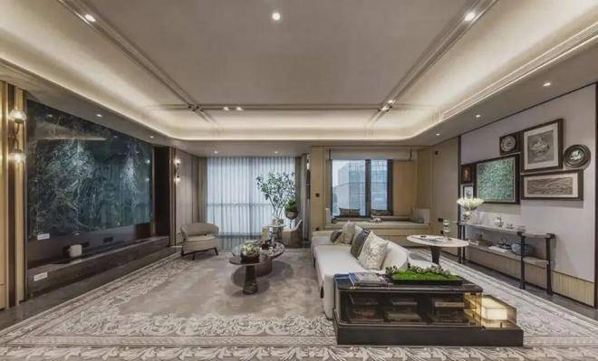在装饰细节上, 从天花板的曲面吊顶、墙体的圆角过渡,到定制家具的流畅线条 ,都在诉说喜曲不喜平的优雅,天花吊顶,更有刻槽工艺,融入项目logo,赋予业主独一份的尊崇。