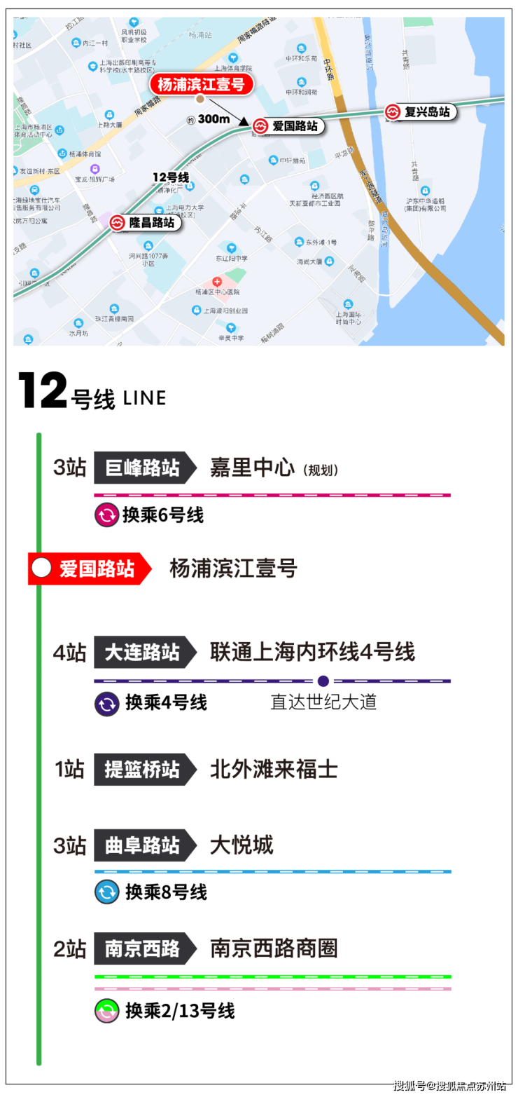 直线距离12号线爱国路站仅约300米,从爱国路站出发,4站就能进内环可换乘4号线,再坐3站就到世纪大道;离北外滩来福士也仅5站,8站到大悦城,10站到南京西路站。(以上数据来源百度地图)