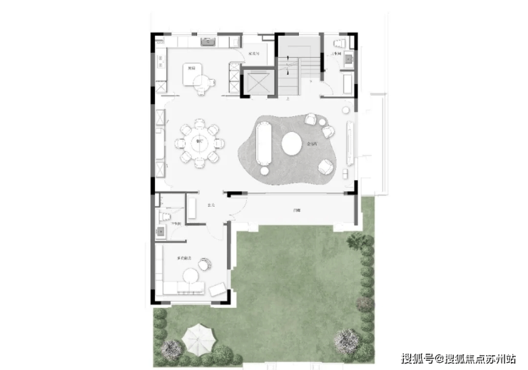 一梯一户设计,五面宽朝南,动静分区;先看动区,U型中厨、独立西厨中岛、独立家政间以及超大餐客厅+多功能空间;