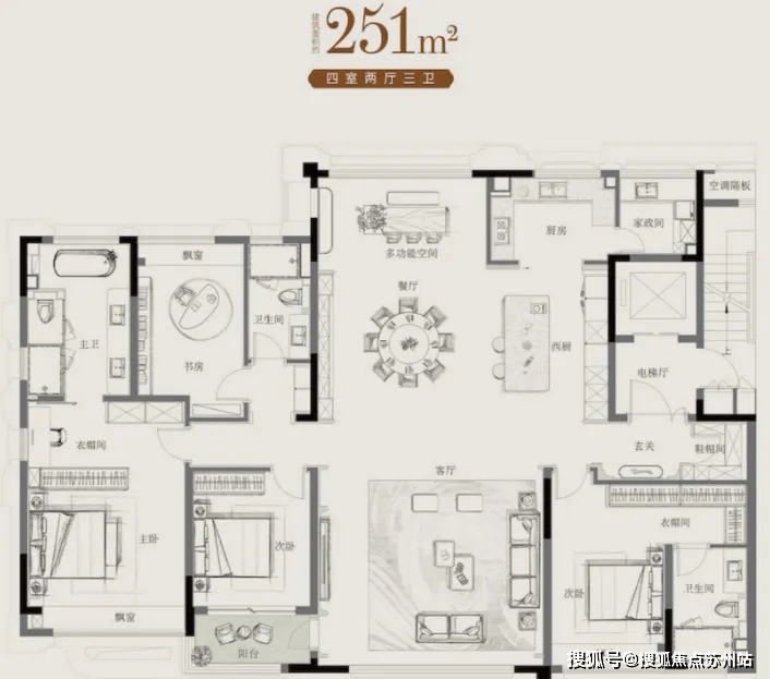一梯一户,大四开间朝南+中西双厨+封闭阳台,LDKB设计,客餐厅、多功能空间一体化,朝南双套房。