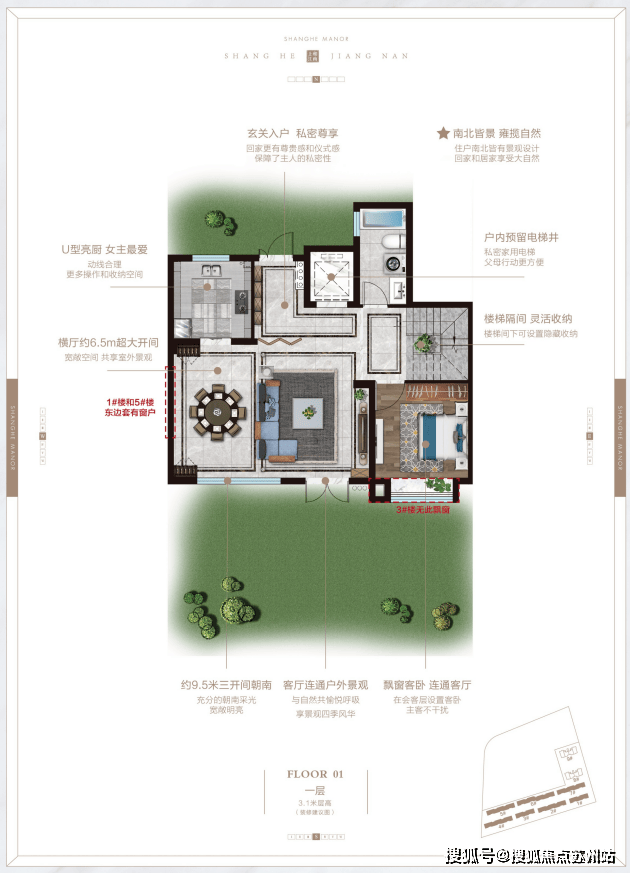 The living room features a 3.2-meter panoramic bay window with a wide viewing angle