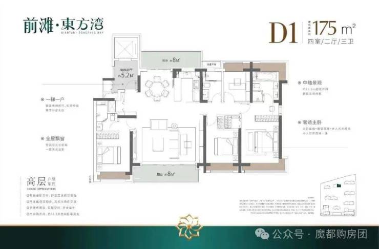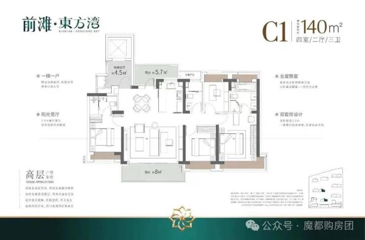 ④产品升级:全铝板立面+带恒温泳池会所+全部(类)1梯1户+标准层高3.1-3.15米,适配高端改善人群居住.