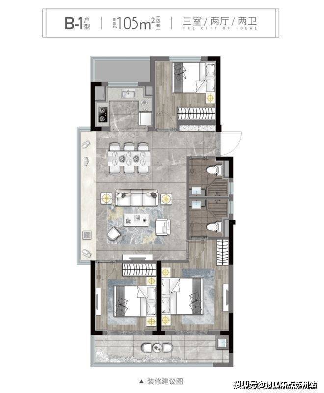 89㎡三房两卫:杭州辰春澜城售楼处电话☎:400-8828-814(售楼处预约看房热线)南向6米双联阳台,LDK一体化餐客厅(约23㎡),主卧套房+观景飘窗,小户型实现三代同堂。