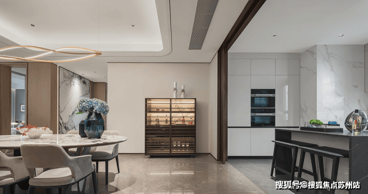 约7.7M超宽客厅及南向瞰景阳台,这个南向采光面的尺度感堪比别墅;另外,客餐厅+厨房一线相连,非常标准南北通透,
