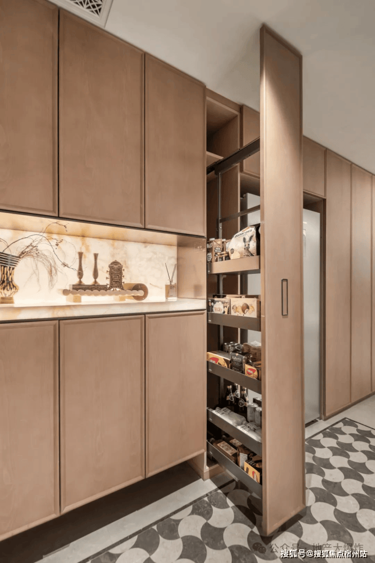 厨房多功能调味拉篮、定制谷物抽屉全部配齐,让瓶罐各归其位,连做饭这么烟火气的事都变得诗意起来;