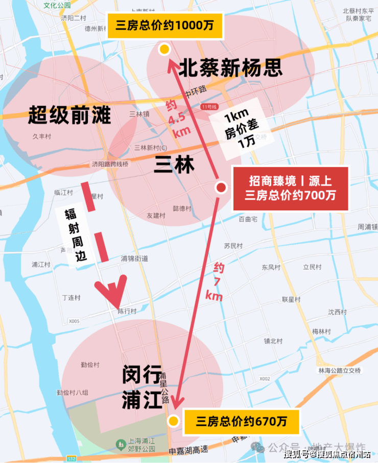 北面直线距离约4.5km的北蔡新杨思,板块在售新房单价陆续超10万云+,想买三房预算需破千万,每隔1km房价就几乎相差1万元。
