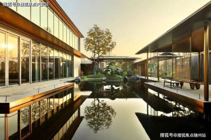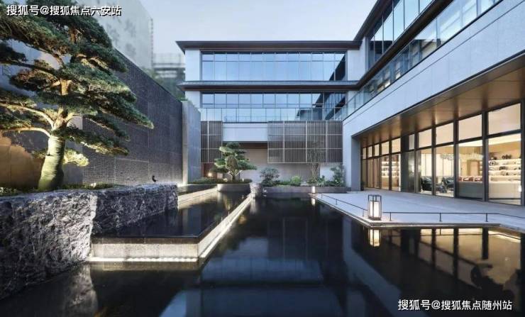 不止飞瀑,实际上在河印府的示范区中,水是贯穿其中的重要元素,从前场到过渡空间再到下沉庭院,或镜面、或溪涧、或叠水,通过不同的形式形成了概念上的「山环水绕」,也是寓意上的好彩头。
