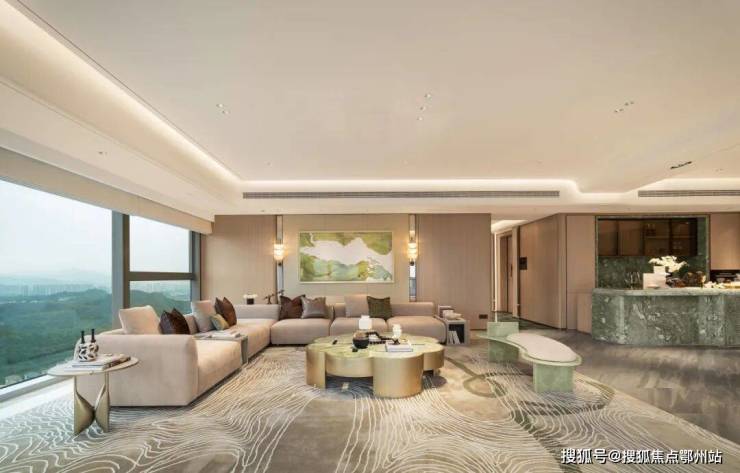 主卧的锤纹门把手、地板花瓣拼、镂花的空调出风口每一个都是世界级的工艺。同样,精装的用材也很考究,从电梯厅到室内各种奢材在这里齐聚, 瑞士翡翠、白雪公主、蒂芙尼绿、巴黎金等奢石,还有仿锤纹夹丝玻璃、仿古锈镜、隐木这些罕见用材增添艺术质感。