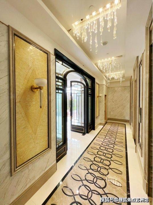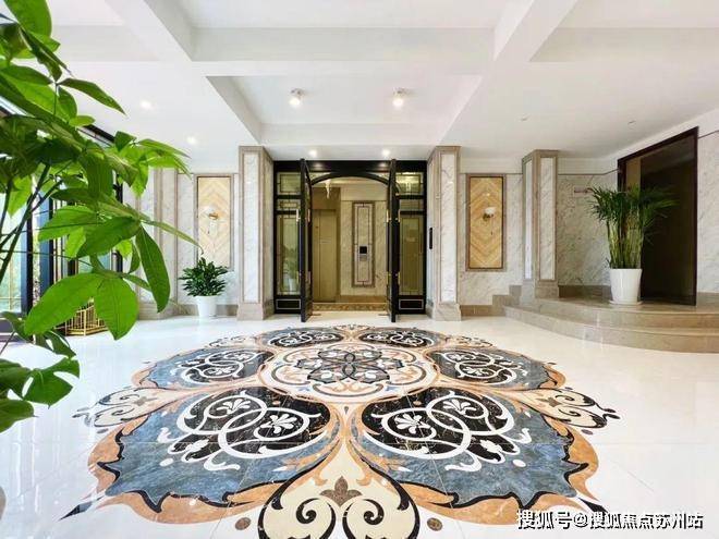 每栋楼也都是地上地下双入户大堂的设计,一层入户大堂地面采用了曼陀罗拼花造型,而且都是纯手工切割技术打造的定制款,造价颇高。