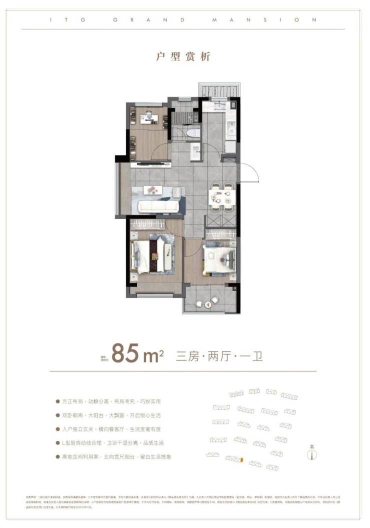 户型解析:约85㎡的3房,这种入门级的产品也要保证居住的尺度感。比如利用L形厨房与餐厅相连接,一体化的设计让空间充足利用。比如次卧连接阳台,就是人性化考虑到给他们一个私密的追光天地。