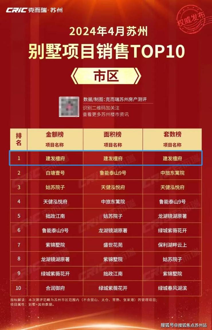 建发·檀府斩获苏州别墅项目销售“三冠王”,套数、面积、金额全部都是「TOP1」,实力霸榜。(数据来源克而瑞)