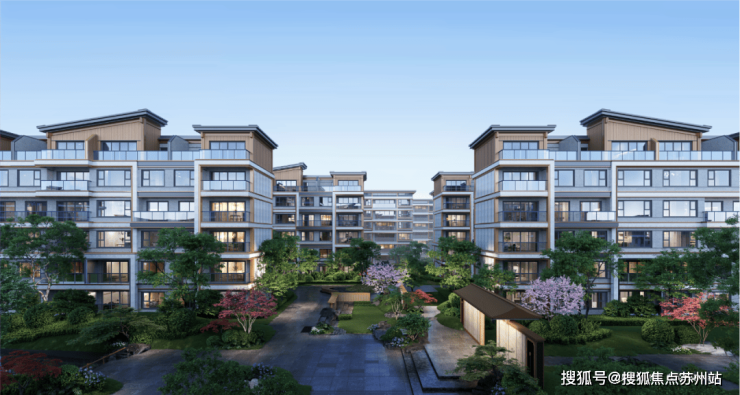 项目作为相城首个新中式 “禅境”系产品,外立面借鉴了虎丘湿地飞鸟造型,首次运用创新斜面坡檐,材质采用 浅灰色真石漆+深灰色金属线条+浅色仿石铝板一体板,整体看来非常有新中式韵味。