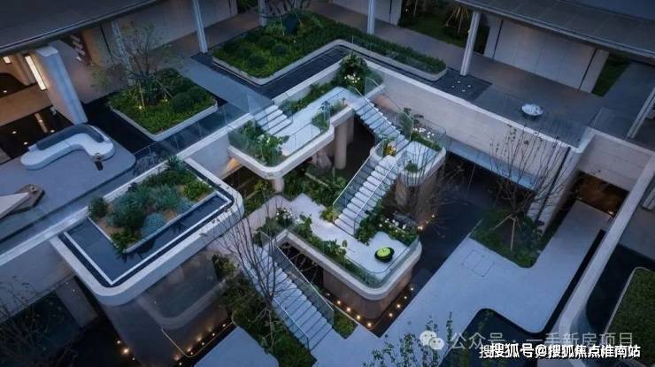 四层悬浮岛屿式阶梯,借鉴全球十二大奢华酒店之一的迪拜丽晶公寓,每一个观景露台都种植着不同的植被,一步一景。