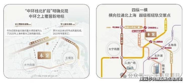 地铁18号线二期(在建)将原本不完全相连相交的地铁1号线、3号线、19号线(在建)横向拉通,北上海轨交因此互联,淞南将成为区域轨交的聚点;同时,本案近邻长江西路地铁站(直线距离约150米),咫尺杨浦背靠江湾,畅达淞南小五角场,1站江杨南路、5站复旦大学、7站五角场,便捷通联。