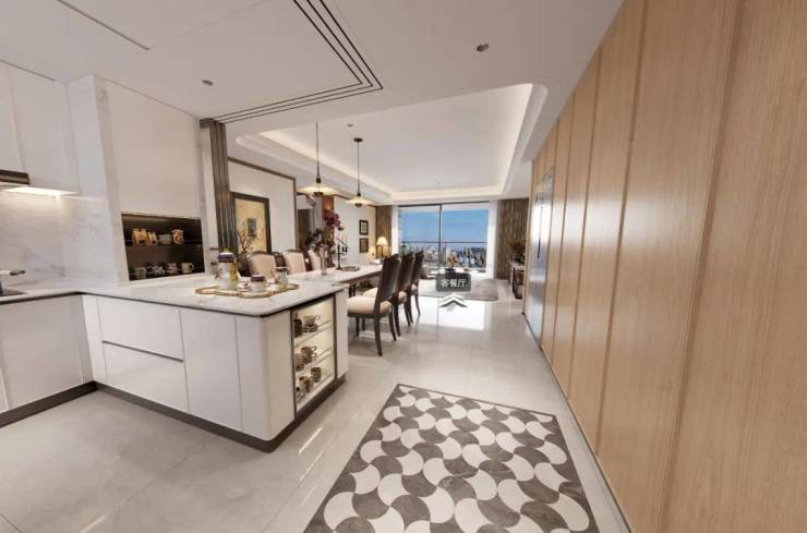 如果你是三口之家,想要极致的公区体验,那就让它完全打开:约6.5米的超大面宽,阳光从早晒到晚。孩子在客厅疯跑,大人在餐厅喝茶聊天,那种烟火气和社交感,是混在一起的。