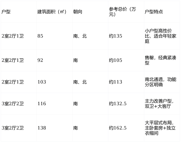 参考均价约 11,500元/㎡ ,在售户型涵盖建面约 85㎡、92㎡、103㎡、116㎡、138㎡ 的二至四居室,主打“全明户型、双卫设计、主卧套房”等改善型配置,满足三代同堂、多孩家庭的居住升级需求。车位配比达 1:1.05 ,地下车位1342个,地上256个,彻底解决停车焦虑。