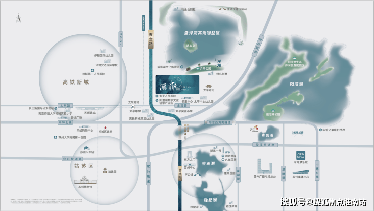 战略定位 :项目位于相城区聚金路与渭泾塘路交汇处,紧邻高铁新城北拓展区,作为苏州"北拓战略"重要节点,直接承接高铁新城核心区资源外溢,定位为"生态宜居中心"。板块依托盛泽湖、阳澄湖双湖资源,打造苏州北部"双湖"生活圈,未来将融入高铁新城"双中心"发展模式,区域能级持续提升。
