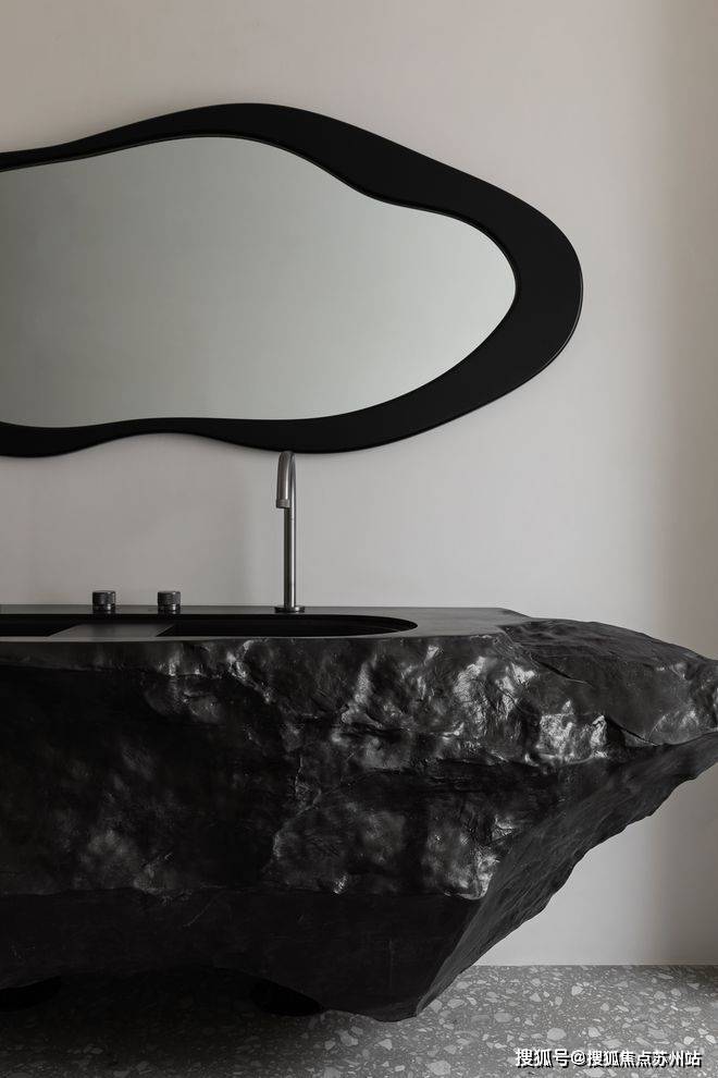 通过极简主义的渲染,配合洞穴抽象元素的点缀,在流线镜面和精美黑曜石洗漱台衬托中,勾勒更浪漫的空间场景。