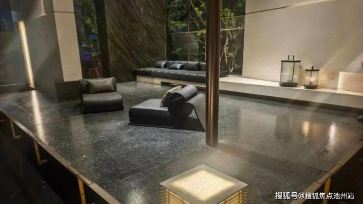 悬崖会客厅廊架地面采用安哥拉黑 3.6m×1.8 m×0.3m 大板铺贴,施工难度极大,需 8 人协作抬运并配合机械作业,最终呈现出大板面的优质效果。会客厅廊架采用昂贵蜂窝不锈钢大板,大气且保证平整度,以高品质材质与精湛工艺,进一步提升空间的质感与格调。