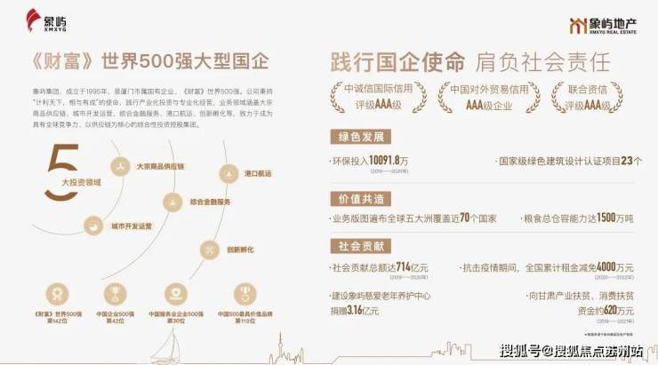 象屿地产成立于1993年,是《财富》世界500强象屿集团旗下全资子公司,以精品住宅开启了30年滚动开发,业务范围涵盖地产开发、商业运营、物业服务、工程代建四大板块,位居2023年中国地产百强排名59位,2023年上半年住宅销售业绩排名31位,堪称稳健优质国企的代表。