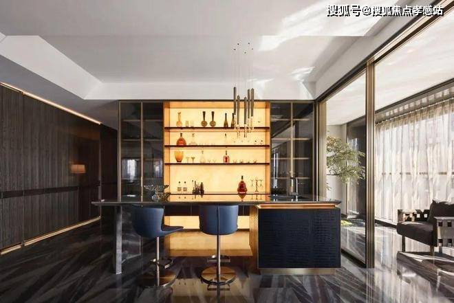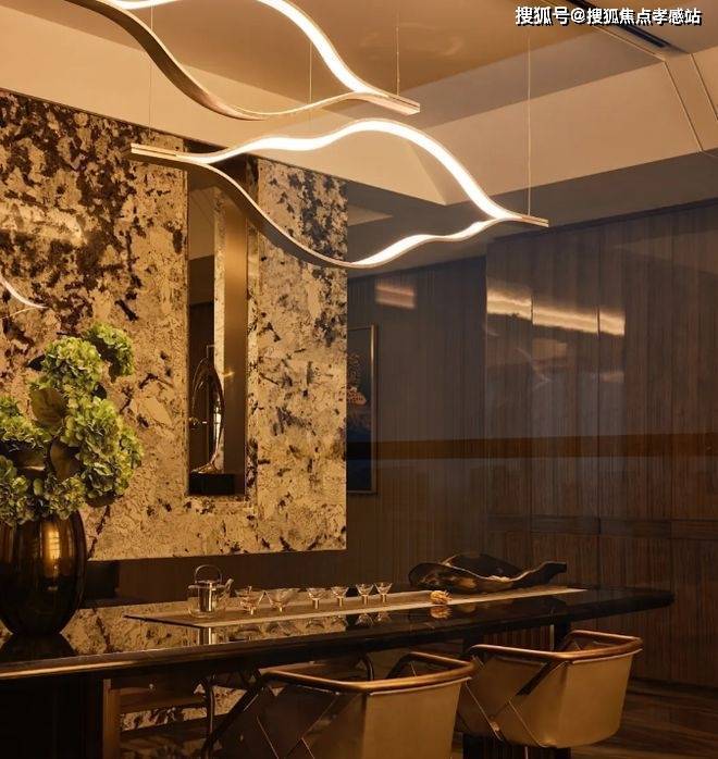 品茗区蜿蜒精致的艺术吊灯,在茶室空间的上空以及金色光影的映衬下,更有了一丝空间的灵动感,座垫编织双厚度皮革杜兰戈结合金属一起,将整体空间的低调奢华隐隐呈现。