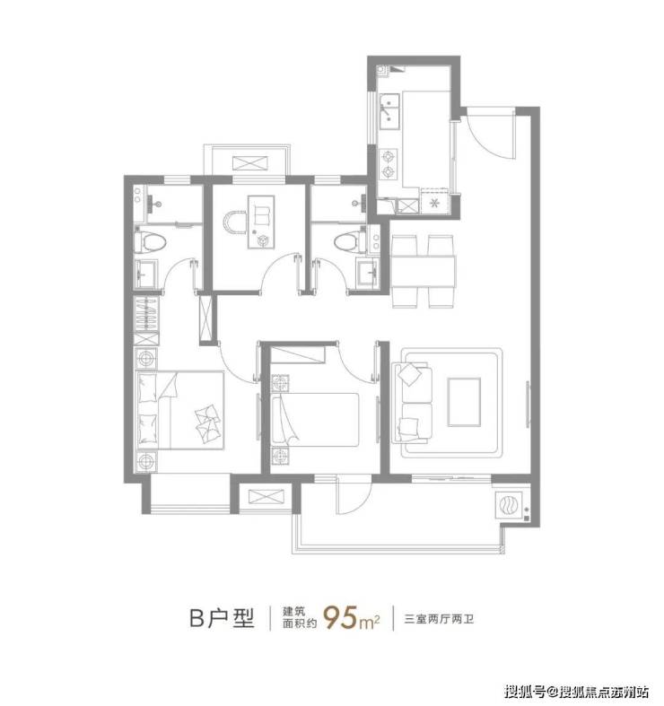 约95㎡的3房2厅2卫户型,这个户型的实用性太高了。能保证业主从二人世界到二胎家庭的全生命周期需求。