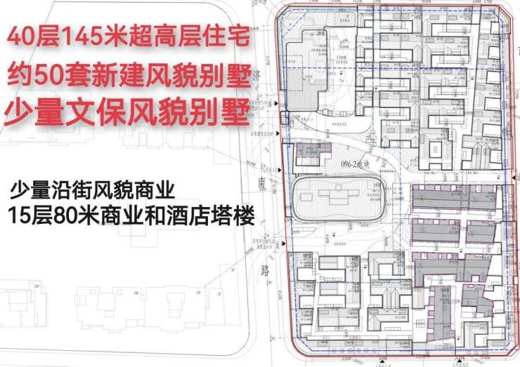 根据公示,项目西半部分096-2地块内规划1幢40F超高层住宅、14幢2-3F风貌别墅,和1幢15F商业酒店、1幢3F商业楼。酒店、商业位于地块西南角。