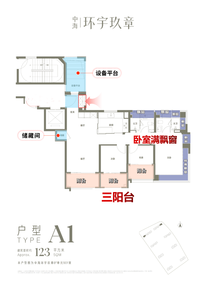 它通过精心设计的南向三个阳台和全屋的飘窗,巧妙地多出了约几十平的面积。这意味着,你花的123㎡的钱,享受的是接近140㎡左右的居住体验。