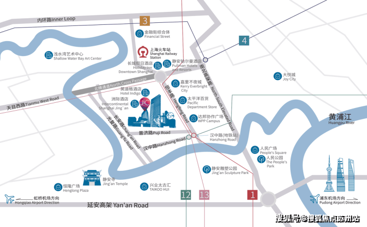 小区出门200米就是汉中路地铁站,站内可搭乘地铁1/12/13号线3条城市轨道交通,步行800米还有1/3/4号线上海站,自驾出行500米就能到南北高架与北横通道交汇。