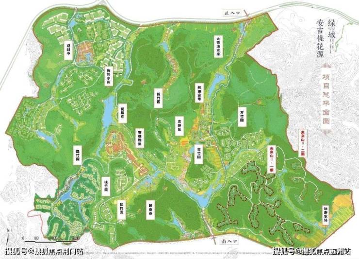 绿城安吉桃花源山峦起伏、水源充沛,旨在营造山居理想生活服务设计体系,打造绿城农旅居养复合型理想小镇范本。桃花源已建成项目类型多样,包括了高端中式住宅区(紫竹园、桂竹园、方竹园、青竹园等)、现代山地产品(新竹园)、高端酒店(悦榕庄)、商业街(安桃雅集)以及公共活动区(鲸奇谷、玩嘢农场)等。这些区域在功能上彼此互补,提供了相对完善的周边配套环境。