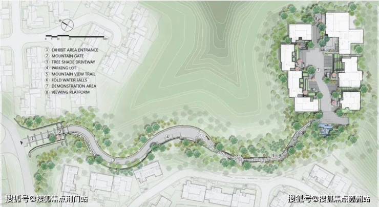 依托现场青翠茂密的植被,设计一道以中国传统山水画中的山门为原型演化而来的古朴山门开启体验的序章,穿门而过便是一条基于现状地势而建的蜿蜒曲折的电瓶车道路。毛石矮墙位于山谷一侧,沿山路铺展开来,营造连贯性的展示界面。约130米后为停车场,同时作为观景平台使用,访客可在短暂停留休憩后,步行至样板院。在样板院入口处结合现状地形设计一处叠水景观,作为整个样板院的对景。样板院内共有7栋建筑,以“山、石、水、木”四种自然元素为灵感设计入户景观,并在场地尽头设计观景平台,作为这场体验的完美句点。