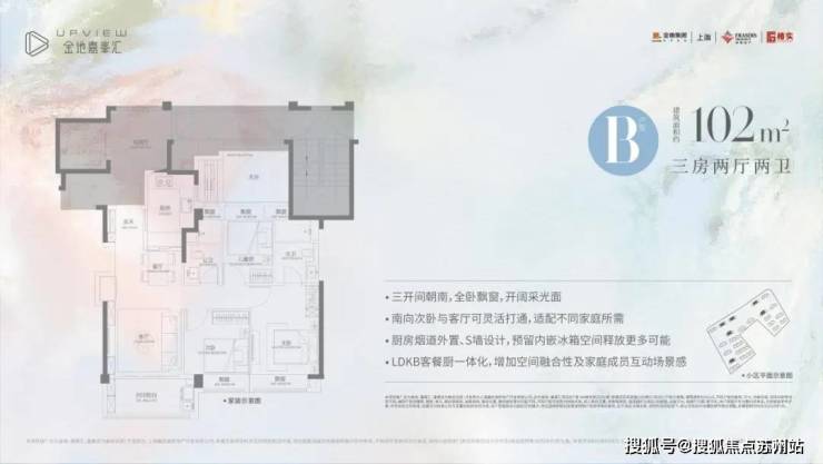 A户型是建面约102㎡3房2厅2卫,该户型三开间朝南,采光效果上佳。大方厅设计,空间开阔自由度更高。南向次卧和客厅可灵活打通,适配不同家庭所需;大进深阳台+全景落地窗,让室内的通透性和视野可圈可点。