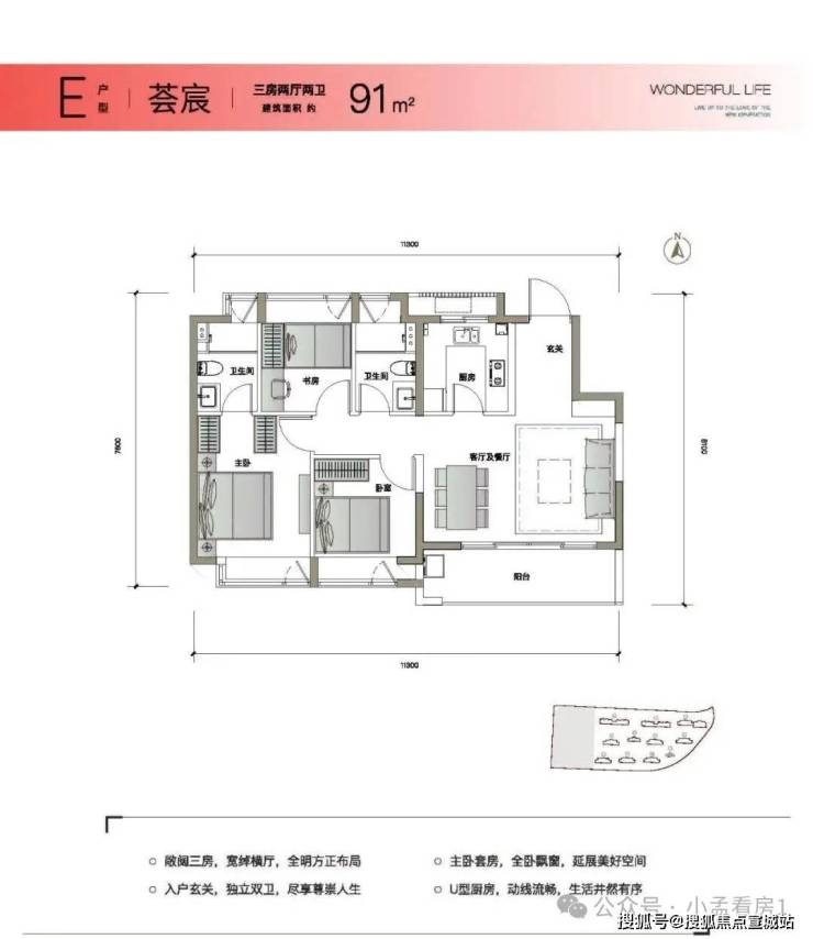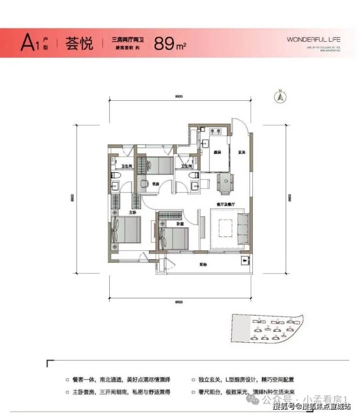 户型:约89㎡三房双卫,约6米双联阳台,尺度拉爆同级产品