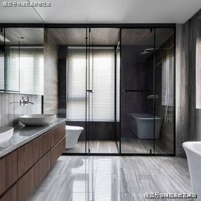 次卫将洗手区外置,古北壹号公馆售楼处电话☎:400-882-8814(预约热线)✔✔✔内部功能分化同样做干湿分离的设计,黑色的岩板瓷砖彰显品位。