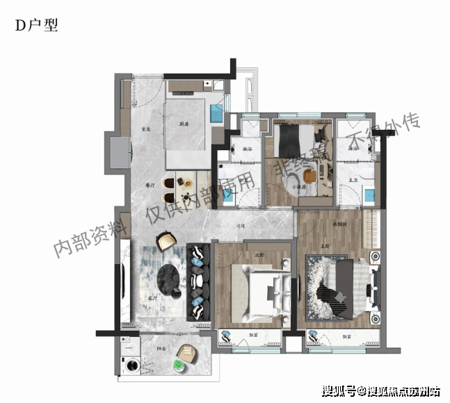 建面约95㎡的D户型,则是上一个户型的升级版,主卧套房设计,保证了主人的私密空间。